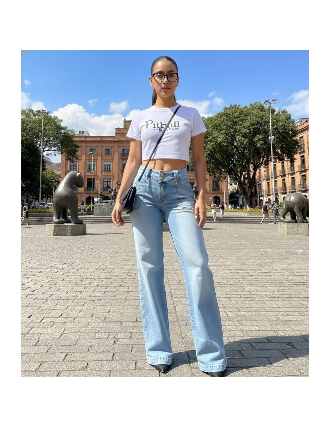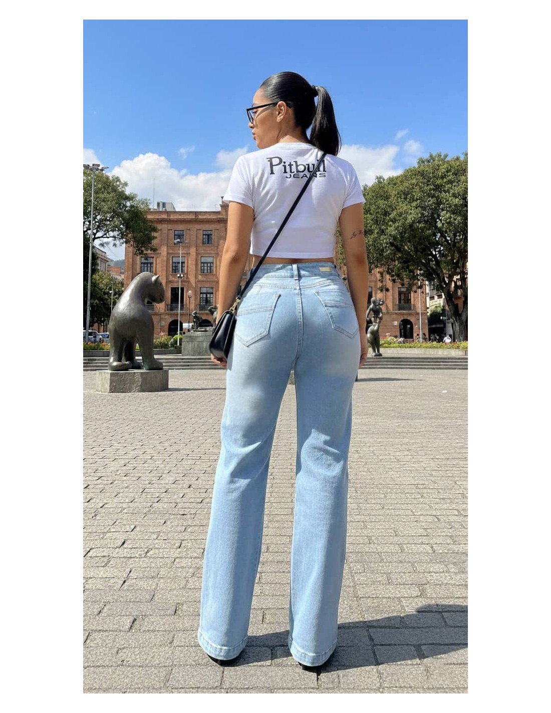 Pantalón Colombiano Pitbull PC7715, confeccionado en mezclilla elástica con diseño moderno de pierna ancha. Ofrece realce natural de glúteos y un ajuste perfecto que resalta la figura con elegancia y comodidad.