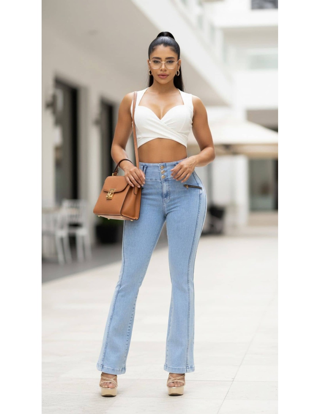 Cuenta con cremalleras decorativas en la parte frontal que añaden un detalle sofisticado, mientras que el corte a la cintura alta y su confección con efecto push up realzan la figura de forma natural.