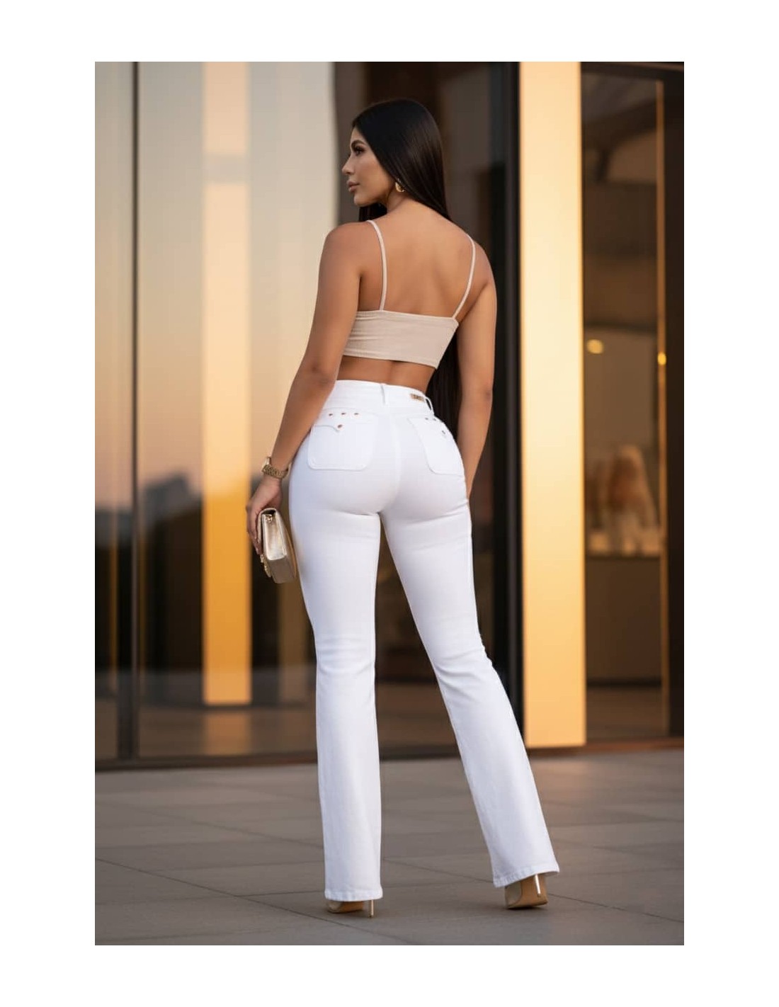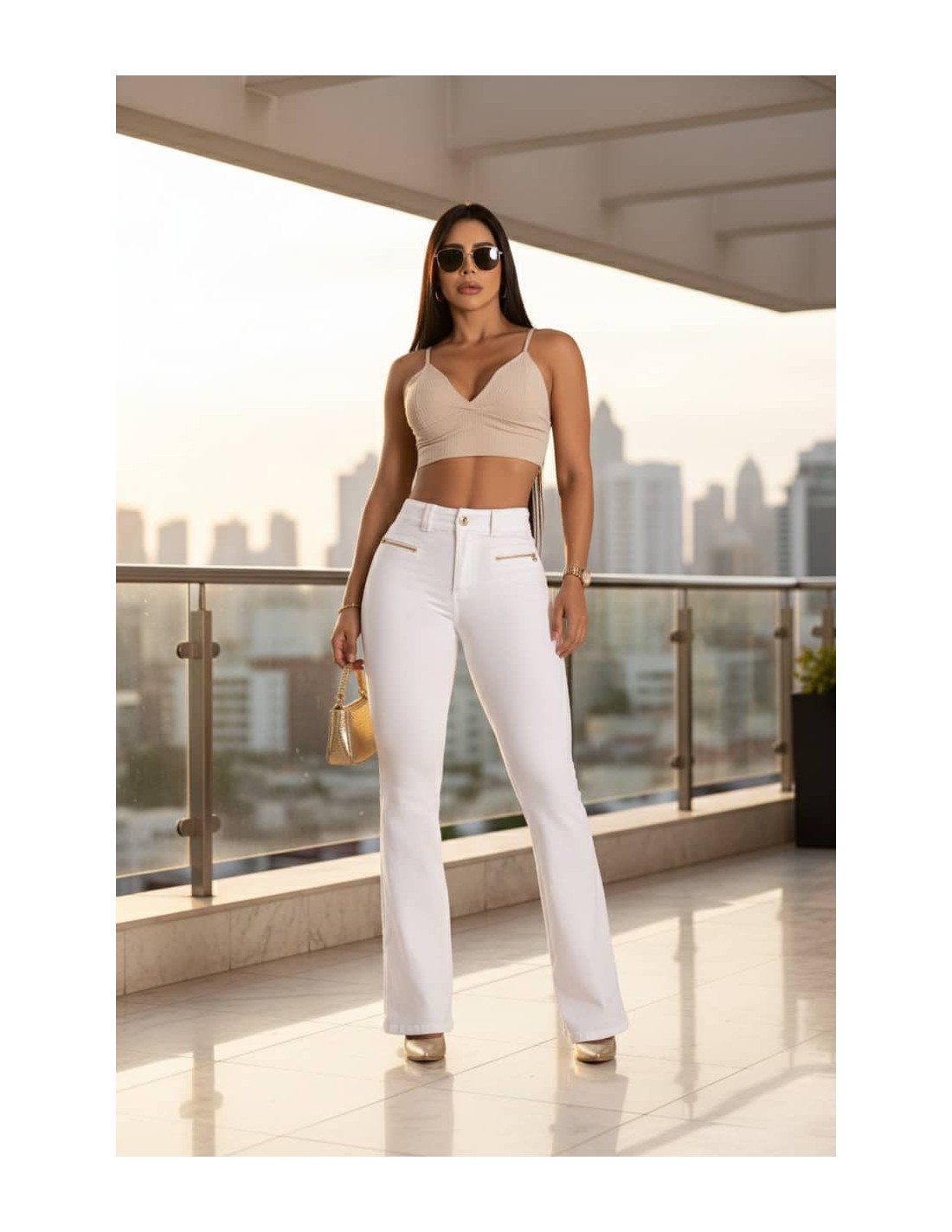 El Pantalón Campana Pitbull Blanco PC-7679 combina un diseño elegante con efecto push-up y corte acampanado. Ideal para realzar la figura con un toque sofisticado.