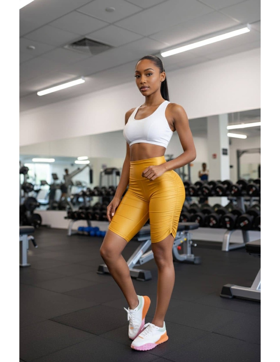 Su short tipo biker con fruncido posterior genera un efecto push up que realza glúteos y estiliza la figura, mientras que el top deportivo brinda soporte y comodidad en cada rutina. La combinación de diseño moderno y confección de calidad hace de este conjunto un referente de la moda colombiana fitness.